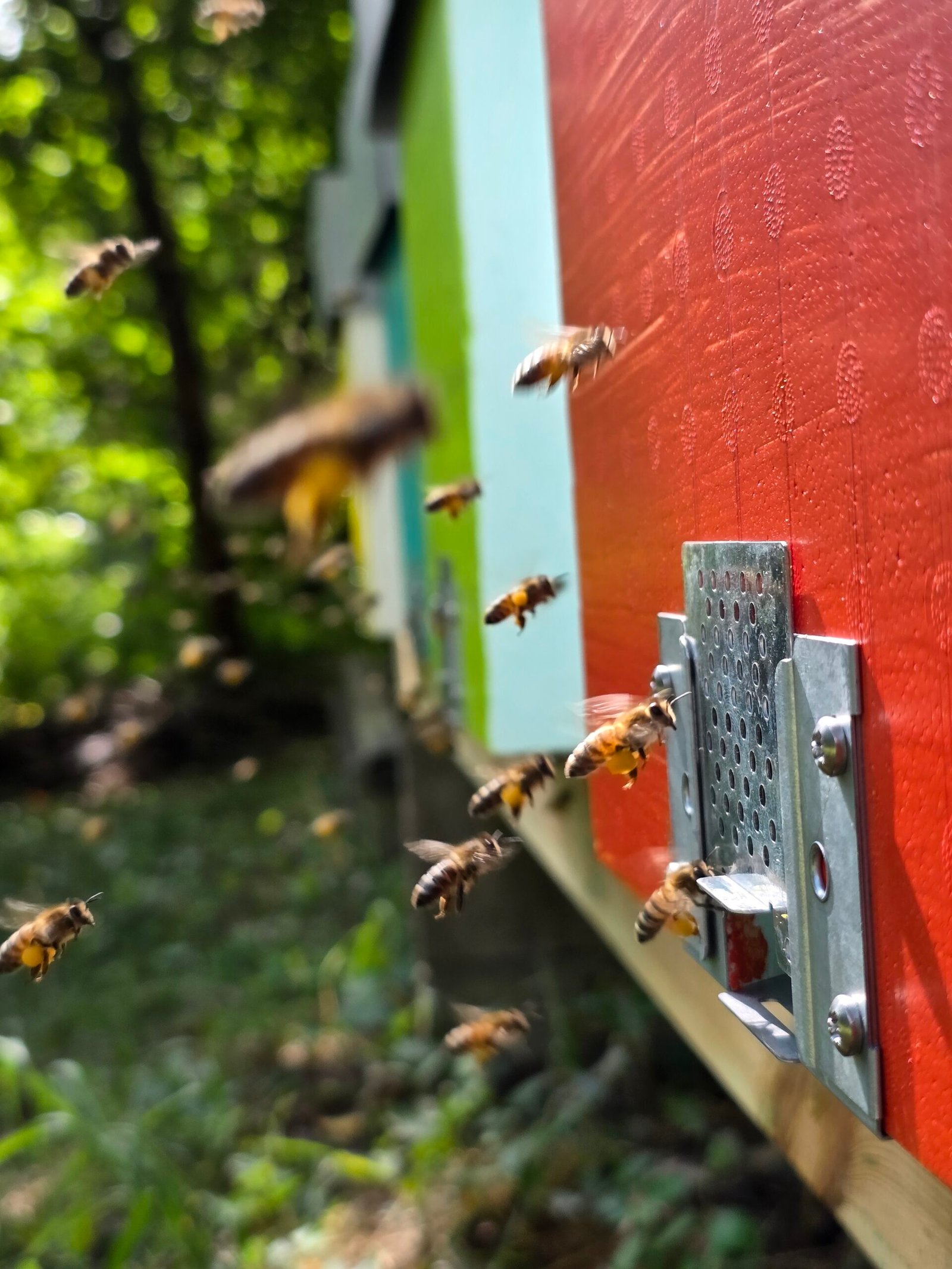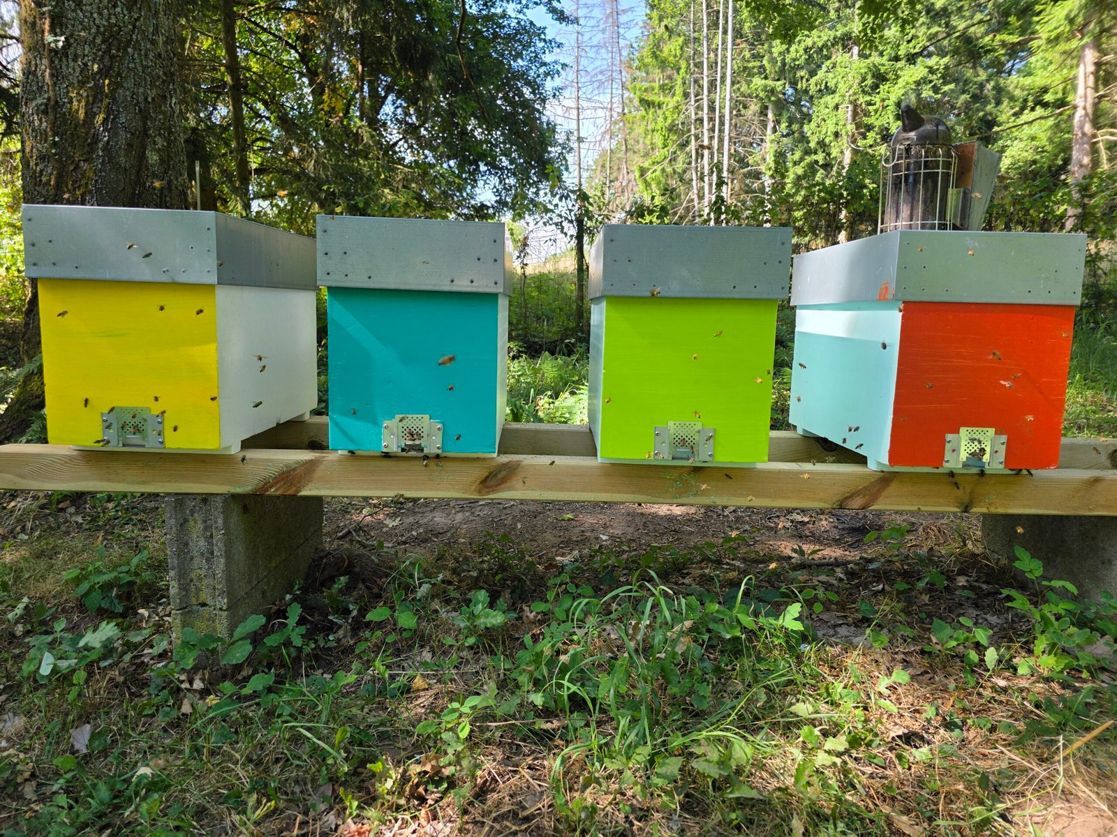 Essaim composé de : 1 ruchette BeeNuk en carton, 3 cadres de couvain, 1 cadre de réserves et 1 cadre de cire gaufrée en cours de construction.